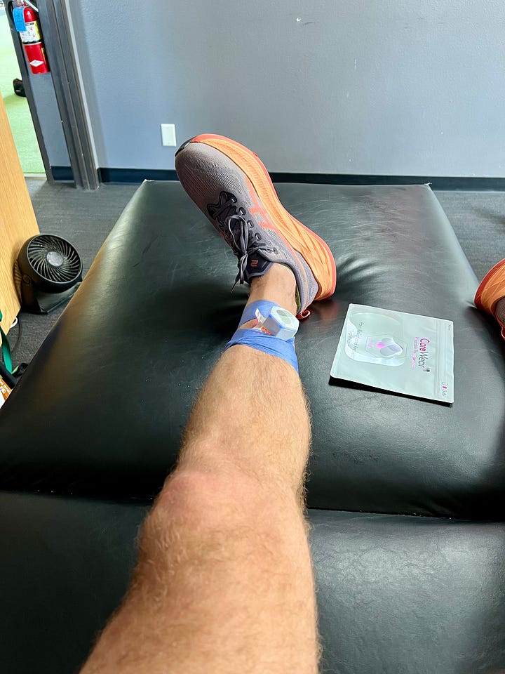 A week later, with my leg still tender and ankle stiff, I made an unusual follow-up visit for additional soft-tissue work. This time, they brought out some electrodes to help restore blood flow.