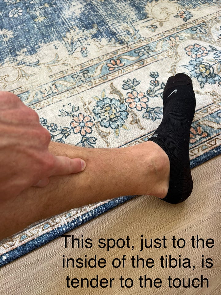 After those sessions, I was hopeful that we’d cracked the code. I could see signs of improvement, but my symptoms persisted. I still walked with a limp, and most steps were mildly painful, a 3 out of 10. I couldn’t get out of the car using only my left foot. There was a strip of tissue along the inside of my lower leg that felt like a strip of bumpy beef jerky when you ran your fingers across it.